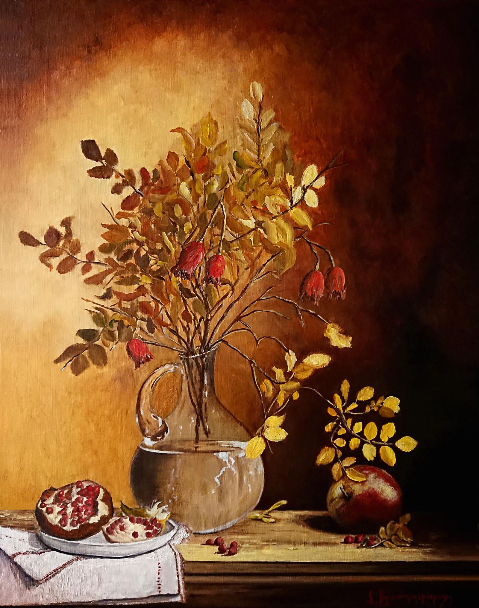 Jug with dried flowers and leaves, apple, napkin and dish with pomegranate